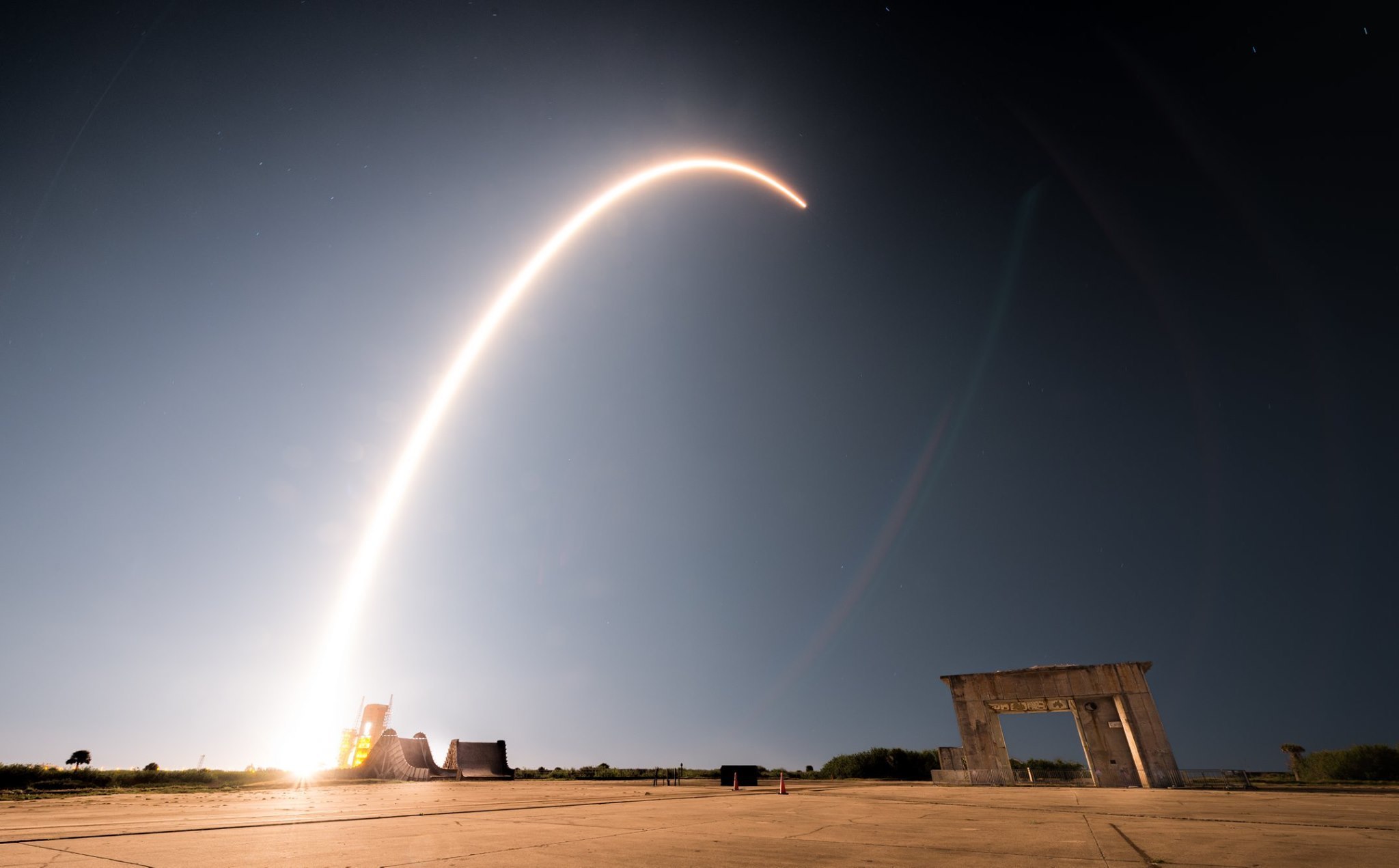 A Falcon 9 rocket launches on Jan. 6, 2020, at Cape Canaveral Air Force Station. The rocket, carrying an installment of Starlink satellites, was the first official launch of the United States Space Force. (U.S. Air Force photo by Joshua Conti/Wikimedia Commons)
