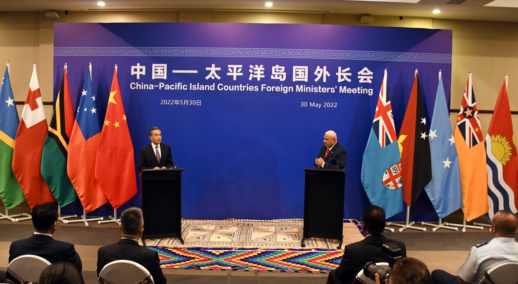 A joint media conference attended by Chinese Foreign Minister Wang Yi and Fijian PM Frank Bainimarama (Fijian Government/Twitter)