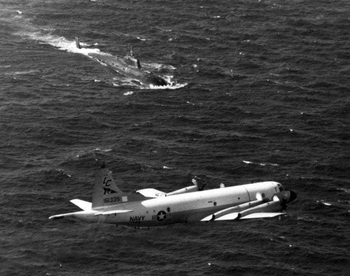 The hunter and the hunted. A P-3C Orion overflies a Soviet Victor III class submarine somewhere over the Atlantic in 1985. If you were in a Soviet Sub and an Orion got on you, it would probably be on your ass and you wouldn’t even know it until you heard its dropped torpedo splash right in front of you. (Photo: DOD)