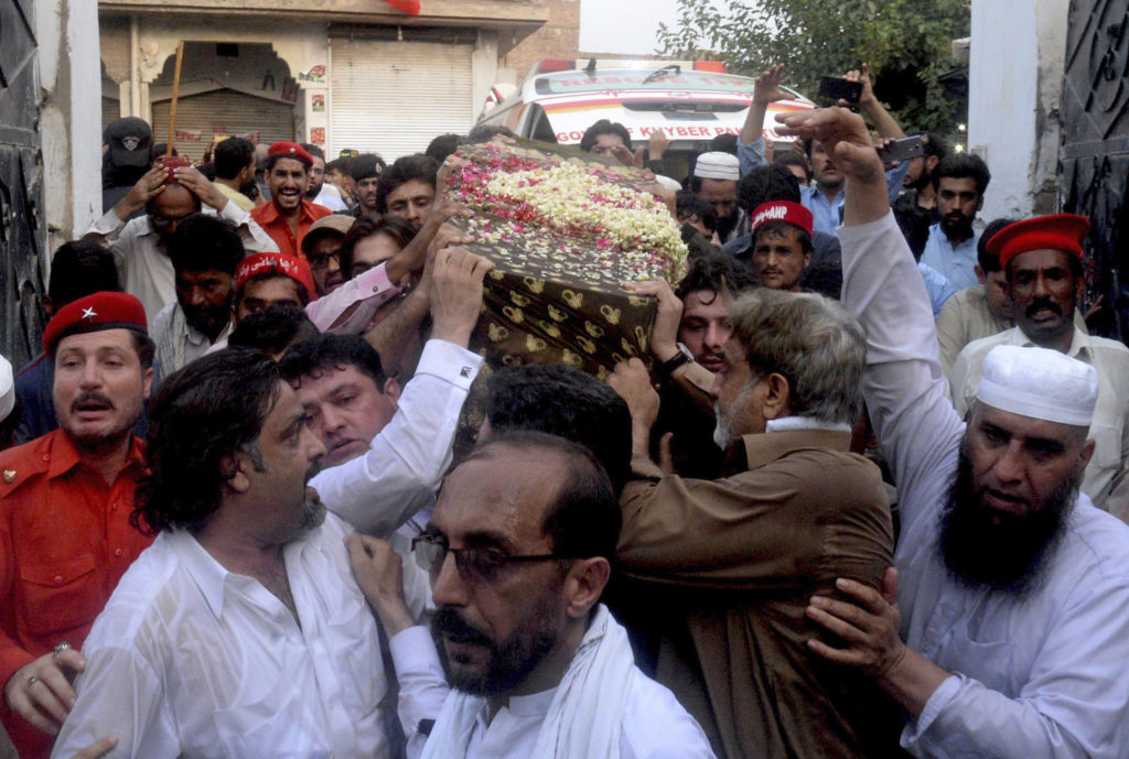 Featured image: People try to comfort a supporter of Pakistani politician Haroon Ahmed Bilour, a victim of a suicide bombing at an election rally, during his funeral in Peshawar, Pakistan, Wednesday, July 11, 2018. The Pakistani Taliban on Wednesday claimed responsibility for an overnight suicide bombing at a rally that killed Bilour, a secular politician, and 20 others two weeks before nationwide elections. | AP Photo/Muhammad Sajjad