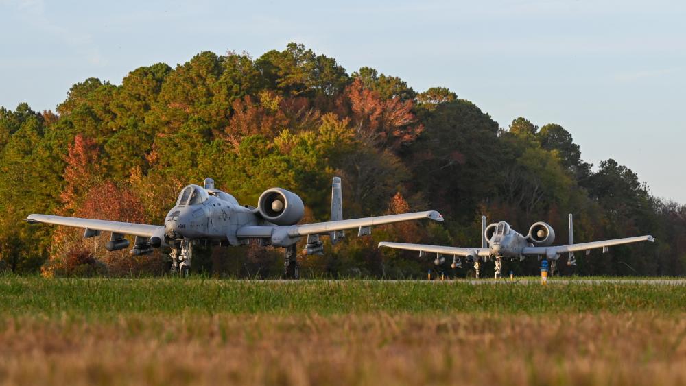 Two A-10 Thunderbolt IIs from the 354th Fighter Squadron at Davis-Monthan Air Force Base taxi down the runway during Bushwhacker 22-07 at Naval Auxiliary Landing Field Fentress, Virginia, Nov. 4, 2022. The 355th Wing trains Multi-Capable Airmen to compete, deter and win the high-end fight, accounting for the ambiguity and uncertainty expected in future conflicts. (U.S. Air Force photo by Airman 1st Class Paige Weldon)