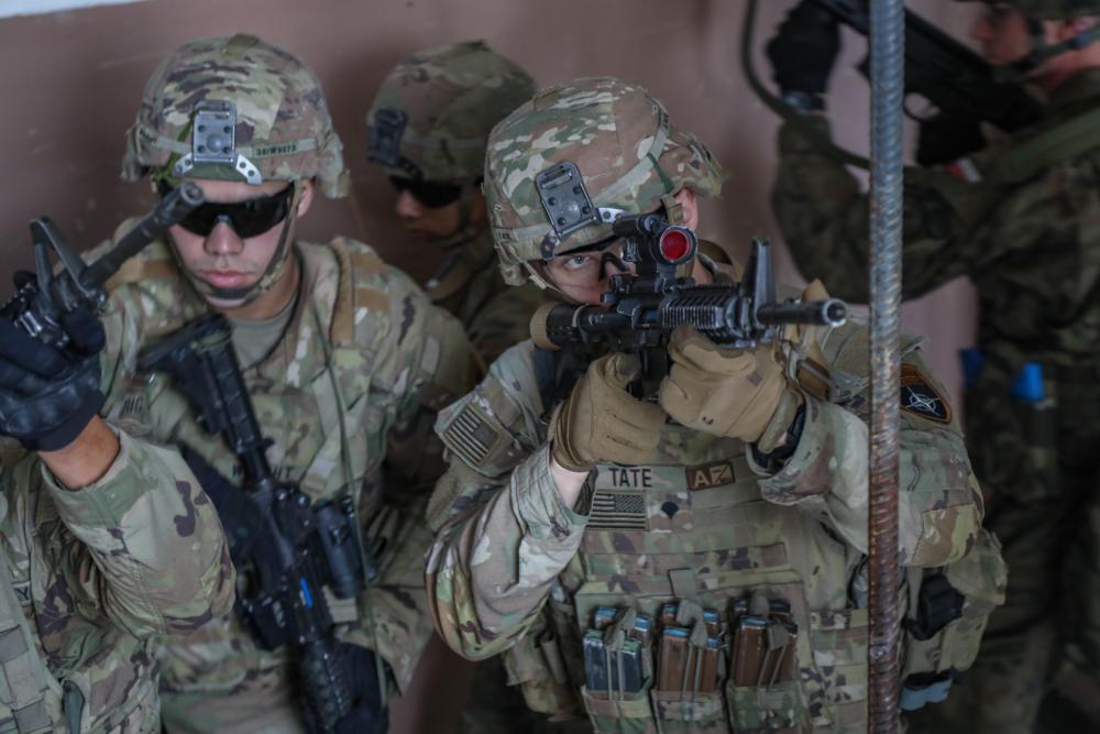 U.S. Army Pfc. Mauricio Sanchez, an infantry rifle-man, assigned to the 3rd Battalion, 8th Cavalry Regiment, 3rd Armored Brigade Combat Team, 1st Cavalry Division (3-1 ABCT) operationally controlled by the 1st Infantry Division (1 ID) clears a corner of combatants during a NATO Urban Tactical Operations exercise in Komorowo, Poland, Oct. 26, 2022. The 3-1 ABCT is among other units assigned to the 1 ID, proudly working alongside NATO allies and regional security partners to provide combat-credible forces to V Corps, America’s forward deployed corps in Europe. (U.S. Army National Guard photo by Staff Sgt. Matthew A. Foster)