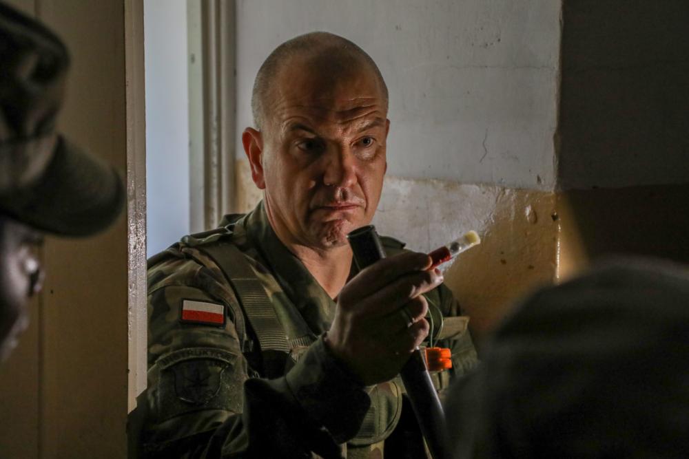 Polish Army explosive ordnance specialist instructor, Josek Roszkowski, assigned to the 5th Mazovian Brigade of Territorial Defense Force identifies a part of a simulated improvised explosive device to the U.S. Army Soldiers assigned to the 3rd Battalion, 8th Cavalry Regiment, 3rd Armored Brigade Combat Team, 1st Cavalry Division (3-1 ABCT) operationally controlled by 1st Infantry Division (1 ID) during a NATO Urban Tactical Operations exercise in Komorowo, Poland, Oct. 26, 2022. (U.S. Army National Guard photo by Staff Sgt. Matthew A. Foster)