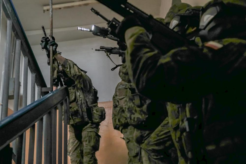 U.S. Soldiers assigned to the 3rd Battalion, 8th Cavalry Regiment, 3rd Armored Brigade Combat Team, 1st Cavalry Division (3-1 ABCT) operationally controlled by the 1st Infantry Division (1 ID) alongside Polish soldiers assigned to the 5th Mazovian Brigade of Territorial Defense Force advance up a stairwell during a NATO Urban Tactical Operations exercise in Komorowo, Poland, Oct. 26, 2022. (U.S. Army National Guard photo by Staff Sgt. Matthew A. Foster)