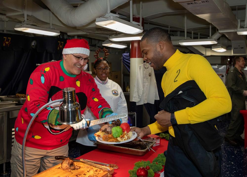 (Dec. 25, 2022) Rear Adm. Dennis Velez, commander, Carrier Strike Group (CSG) 10, George H.W. Bush CSG, serves a Sailor during holiday meal aboard the USS George H.W. Bush, Dec. 25, 2022. The George H.W. Bush CSG is on a scheduled deployment in the U.S. Naval Forces Europe area of operations, employed by U.S. Sixth Fleet to defend U.S., allied and partner interests. (U.S. Navy photo by Mass Communication Specialist Seaman Curtis Burdick)