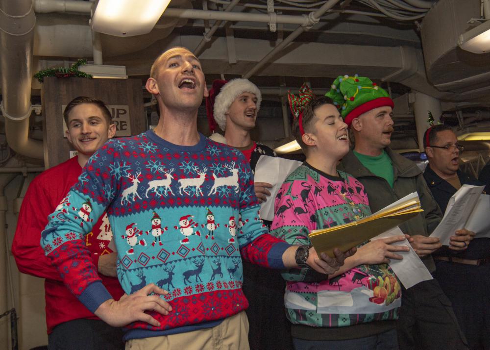 (Dec. 24, 2022) U.S. Navy Sailors sing Christmas carols on the mess decks of the aircraft carrier USS Nimitz (CVN 68). Nimitz is in 7th Fleet conducting routine operations. 7th Fleet is the U.S. Navy’s largest forward-deployed numbered fleet, and routinely interacts and operates with 35 maritime nations in preserving a free and open Indo-Pacific region. (U.S. Navy photo by Mass Communication Specialist 3rd Class Joseph Calabrese)