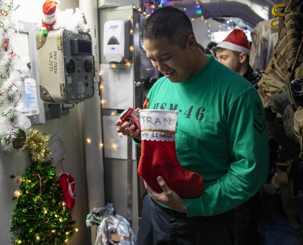 (Dec. 25, 2022) Aircrew Survival Equipmentman 2nd Class Sean Tran, assigned to Helicopter Maritime Strike Squadron (HSM) 46, celebrates Christmas aboard the Nimitz-class aircraft carrier USS George H.W. Bush (CVN 77), Dec. 25, 2022. The George H.W. Bush Carrier Strike Group is on a scheduled deployment in the U.S. Naval Forces Europe area of operations, employed by U.S. Sixth Fleet to defend U.S., allied and partner interests. Carrier Air Wing (CVW) 7 is the offensive air and strike component of CSG-10 and George H.W.Bush CSG. The squadrons of CVW-7 are VFA-143, VFA-103, VFA-86, VFA-136, VAW-121, Helicopter Sea Combat Squadron (HSC) 5, and Helicopter Maritime Strike Squadron (HSM) 46. (U.S. Navy photo by Mass Communication Specialist 3rd Class Chandler Ludke)