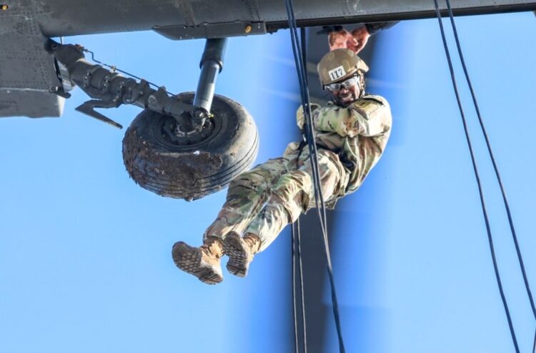 A grinning soldier from the US Army’s 101st Airborne Division (Air Assault) is shown here rappeling from a UH-60 Black Hawk helicopter. In addition to the 101st, soldiers from the 1st Armored Division (Old Ironsides), along with the Romanian Land Forces, The Land Army (France), Royal Netherlands Army, and the Slovak Armed Forces rappeled from a Black Hawks in the last phase of the first multinational Air Assault training at the Romanian Air Base, Mihail Kogalniceanu on January 30th, 2023.