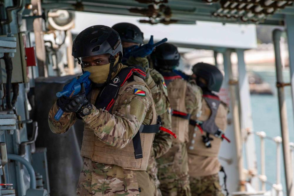VICTORIA, Seychelles (September 26, 2022) – Members of the Seychelles People’s Defence Force demonstrate visit, board, search, and seizure in Victoria, Seychelles, September 26. Combined Maritime Forces launched the two-week mission Sept. 18 to strengthen regional collaboration and enhance operational readiness. (U.S. Army photo by Sgt. Terry Vongsouthi)