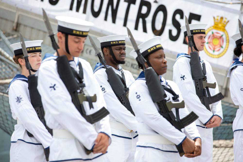 VICTORIA, Seychelles (September 26, 2022) – Sailors of the Royal Navy frigate HMS Montrose (F 236) stand in formation in Victoria, Seychelles, September 26. Combined Maritime Forces launched the two-week mission Sept. 18 to strengthen regional collaboration and enhance operational readiness. (U.S. Army photo by Sgt. Terry Vongsouthi)