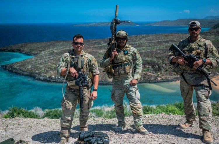 Soldiers from Task Force Wolfhound take a break from training to pose with their weapons in Djibouti, Africa.