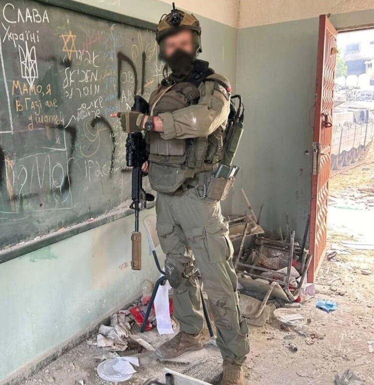 A Jewish Ukrainian soldier in Gaza points out the words "Glory to Ukraine!" on a school blackboard.