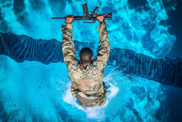 An unidentified soldier begins a swim test in preparation for an upcoming Jungle Operations Training Course he’ll be attending.