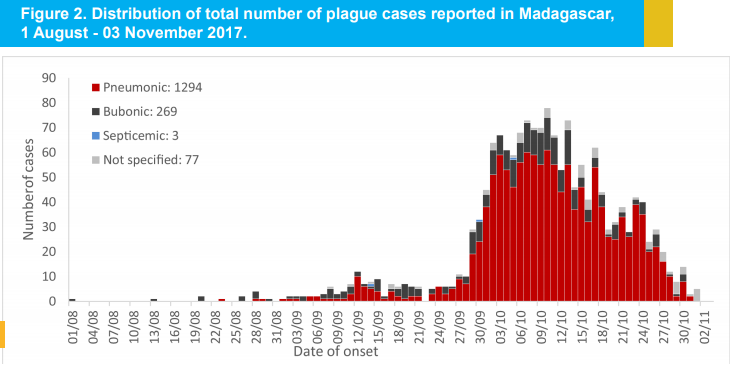 A report from the World Health Organization (WHO) from 6 November, 2017 has given insight as to the spread and severity of the plague in Madagascar. According to the report, there are 1,947 cases and 143 deaths. The Case Fatality Rate (CFR) is approximately 7%, which means that 7% of the patients that have contracted plague have died. 74% were “clinically classified as pulmonary plague” or pneumonic, 15% bubonic and only one was septicemic. These are not three random strains of plague, they generally start as bubonic and if they reach the lungs they become pneumonic, which can then be spread by coughing or other airborne means. 50 of these cases are believed to be aid workers.