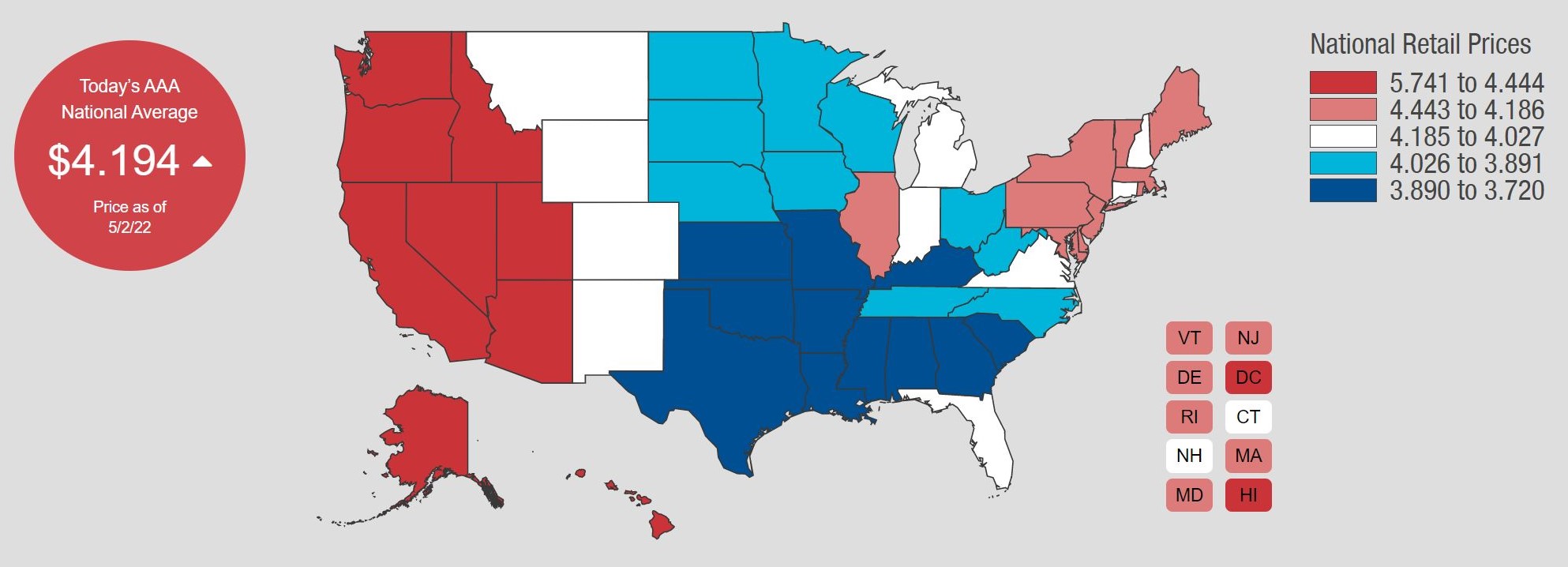 A snapshot in time. Current gas prices in the US as of May 2nd, 2022. Graphic courtesy of AAA.