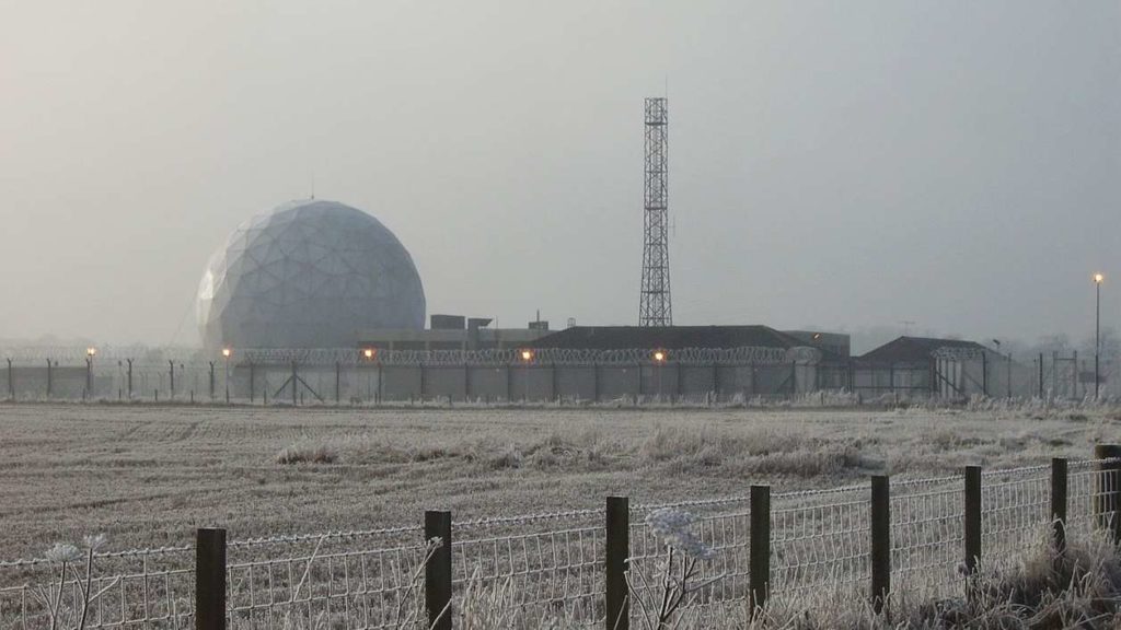 SATCOM II Satellite Ground Listening Station is situated on the S side of the World War II airfield ( ) and B918 public road and set within a high double fenced compound. The Station stands on the former taxiway of the airfield.
