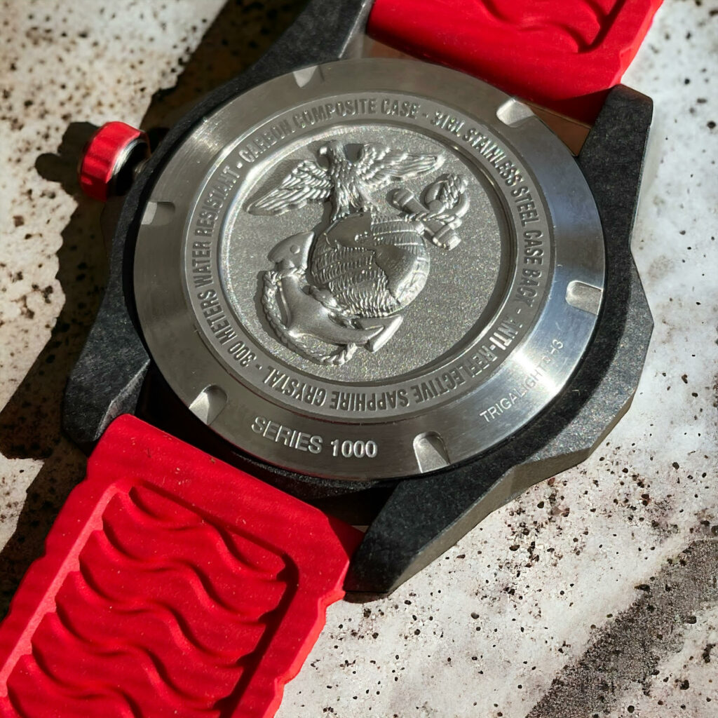 The movement is the same as in the USMC watch, as is the sapphire crystal with antireflective coating. You’ll be pleased with the supple 22mm genuine rubber strap.