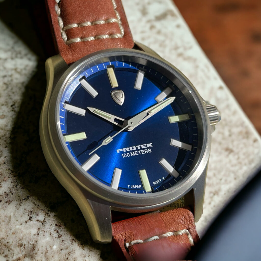 Last but not least is my personal favorite, the ProTek Field Series 3003 with a stunning blue sunray dial photographed here by yours truly. The waterproof strap is made from genuine Italian leather and is 20mm at the lugs.