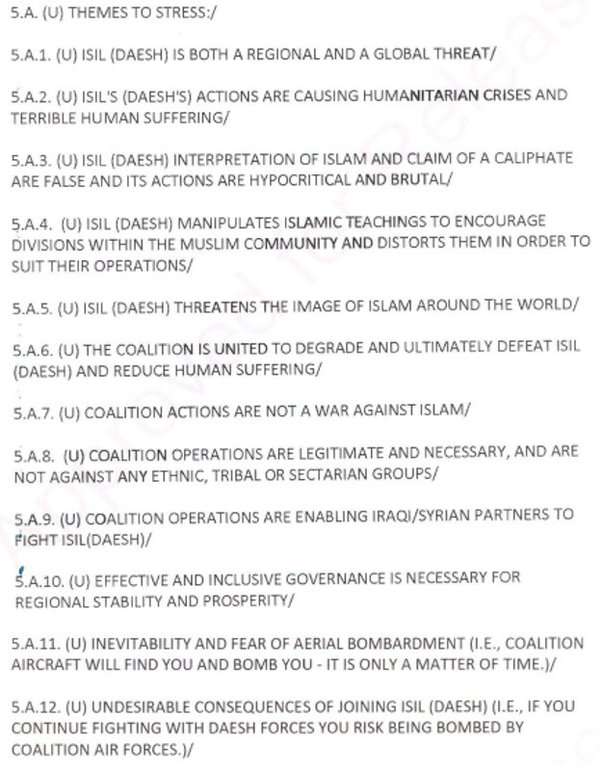 What follows is a list of approved themes for leaflets and other broadcasts in Iraq and Syria as part of the American-backed campaign against ISIS. It is worth noting that the list of themes to be avoided is not for public distribution, and I will not post that.