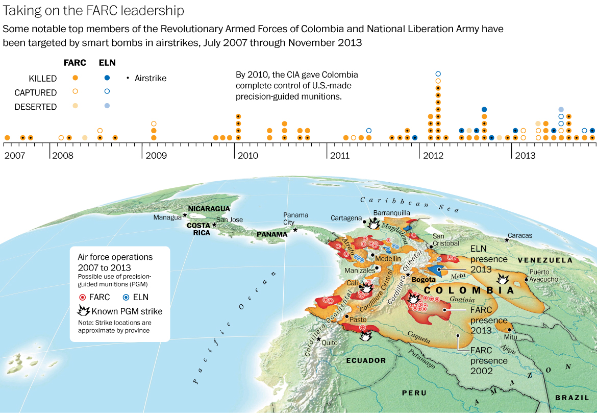The key to success in the CIA’s covert action program in Colombia is derived from two chief services: “real-time intelligence that allows Colombian forces to hunt down individual FARC leaders and, beginning in 2006, one particularly effective tool with which to kill them.”