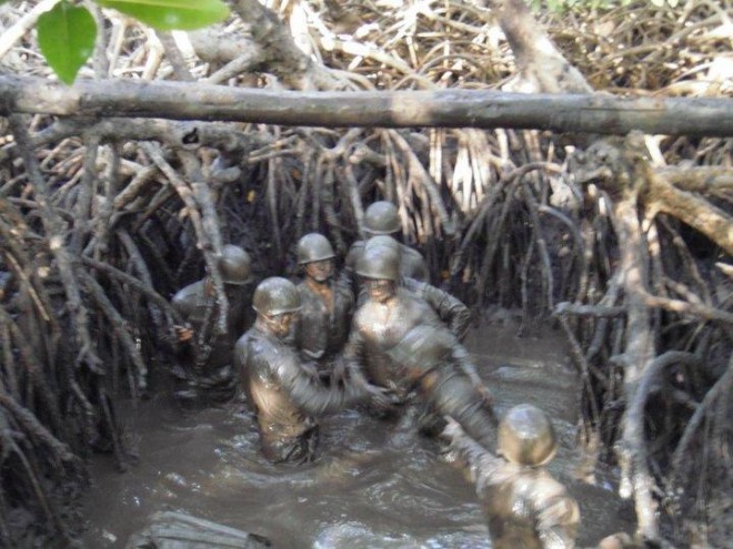 I have to admit that some of the details and timelines may be a bit off; I went to the course over 15 years ago. The first two plus weeks of the course are the training phase. First off, we did our water training and obstacle course. The water o-course was kind of like a jungle gym set in the water. It was tough, but nothing too crazy. The most memorable part of the training phase was by far the obstacle course throughout the mangrove trees. If you’re not familiar with mangroves, they’re basically trees with exposed root systems in coastal swamps. The course was through the mangrove roots and the mud we crawled, humped and “swam” through was so thick you actually had to wipe it off of your face in order see. And, to make things even better, it was full of huge crabs and smelled like garbage.