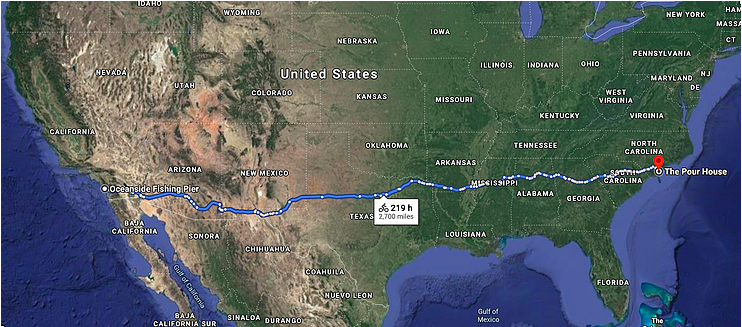 On May 26th I will be departing Oceanside California via bicycle and riding to Wilmington North Carolina. I am self-funding my travel and estimate this trip to take around 40 days with a goal arrival date of no later than July 4th. This totals to roughly 2700 miles.