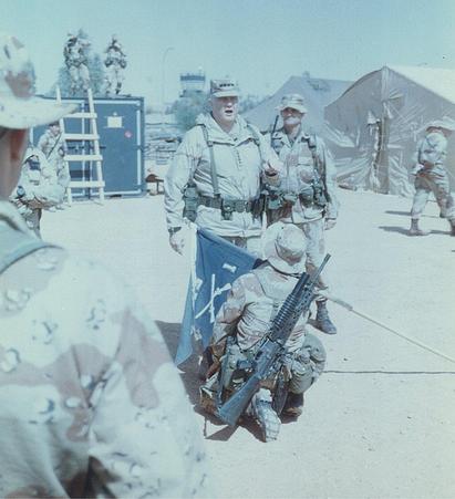 Although the shooting war was over, tensions between Iraq and its neighbor Kuwait remained. Towards the end of 1991 border problems plagued the two countries which resulted in numerous small engagements between the nations. It almost seemed as though Saddam was on a warpath once again with Kuwait. In response, elements of the 1st Ranger Battalion and Regimental Headquarters led by LTC Ken Stauss (died 1992 in helicopter crash) left Hunter Army Airfield towards Ali Al Salem Airfield, Kuwait. On December 8/9th, 1991 the Rangers conducted a daylight combat jump as a tactical show-of-force against Hussein followed by a 50km overland movement and live fire exercise. Although the ground war was well over, the area was still semi-hostile zone (it wasn’t until 1995 that Operation Desert Storm was officially over). The Rangers who participated in the jump did not receive a combat jump star or a CIB, but a couple of years down the road the participants were awarded their combat scrolls for what was dubbed Operation Iris Gold. They were also awarded the Southwest Asia Service Medal for their participation.