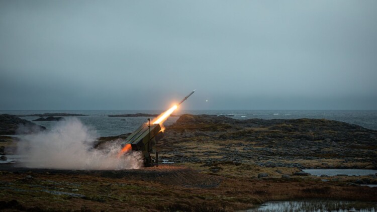 An AMRAAM-Extended Ranged is launched from a NASAMS during a test event in Andoya, Norway, in May 2021. (Image source: Raytheon)