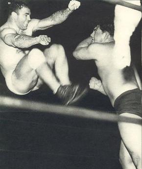 Joe Savoldi demonstrates his flying dropkick in the 1930s.
