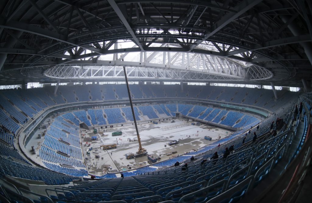 This Monday, Oct. 3, 2016, file photo shows inside view of the soccer stadium, which is under construction on Krestovsky Island, in St. Petersburg, Russia. A Russian official says a North Korean man has died while working on a stadium for the 2018 World Cup. | AP Photo/Dmitri Lovetsky, File