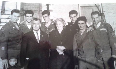 Edgar Britt’s brother Howard, far left standing next to the author’s father after returning from World War II