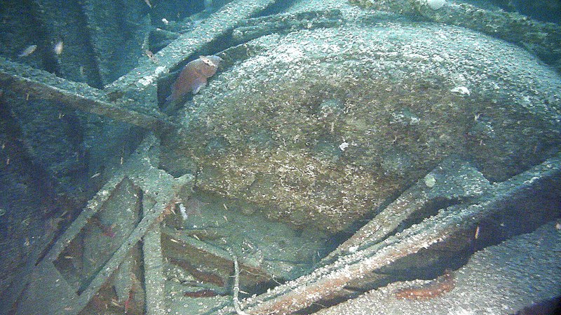 An underwater photo taken by an unmanned underwater vehicle shows the boiler compartment at the shipwreck site of the US Navy tugboat USS Conestoga (AT 54) in the Farallones National Marine Sanctuary. (National Museum of the US Navy, Public domain, via Wikimedia Commons)