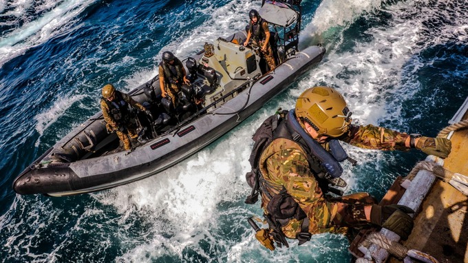 The Royal Marines boarding teams are a highly trained elite unit within the British Navy. They are trained to intercept and board moving vessels whilst at sea. They specialise in close quarter combat and a number of insertion methods onto vessels. They can often be seen training on the River Thames and Portsmouth, and indeed working with the Special Boat Service (SBS) to fine tune their skills for such events like that on the gulf.