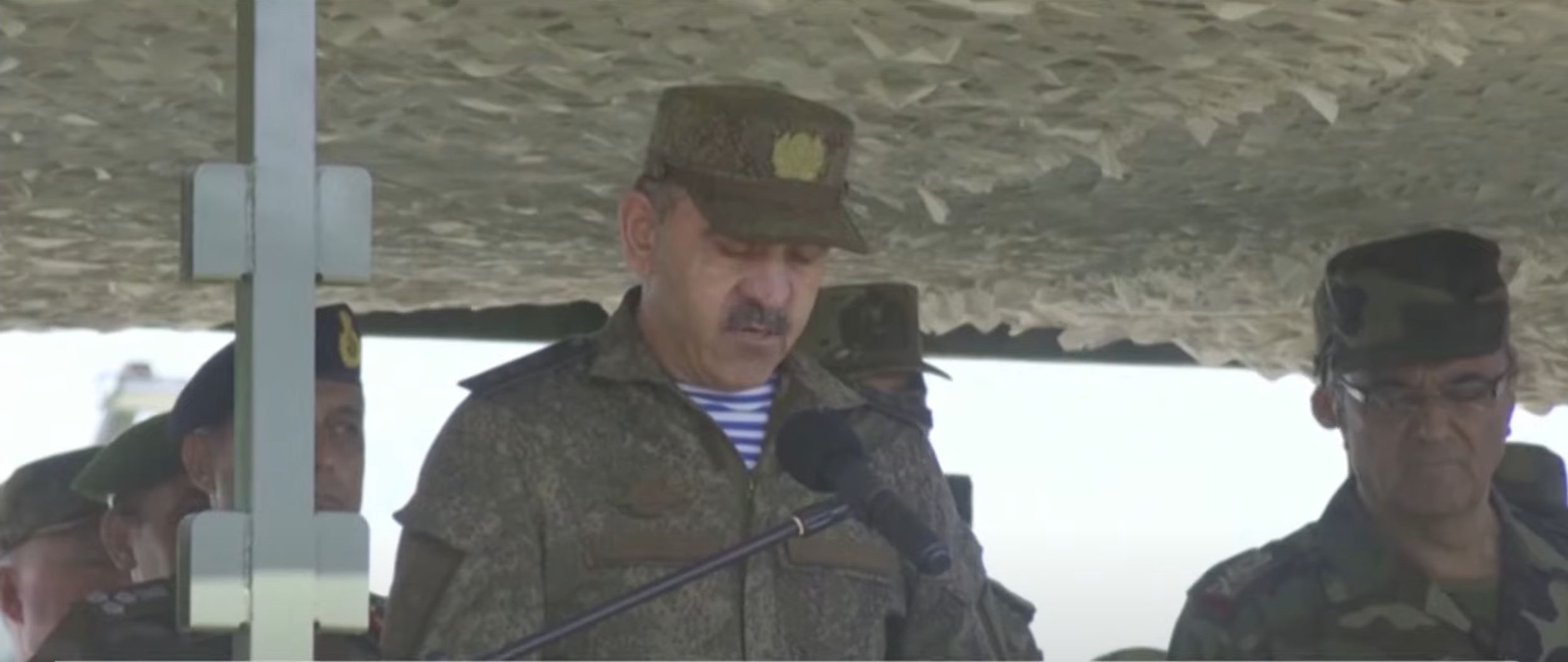 Russian Deputy Defense Minister Yunus-Bek Yevkurov addresses the international gathering of troops. Screenshot from YouTube and France 24