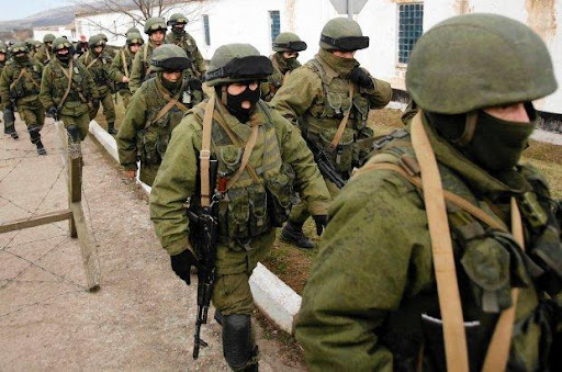 Well-equipped Russian soldiers occupying Ukraine in 2014. Note the absence of any rank or unit insignia