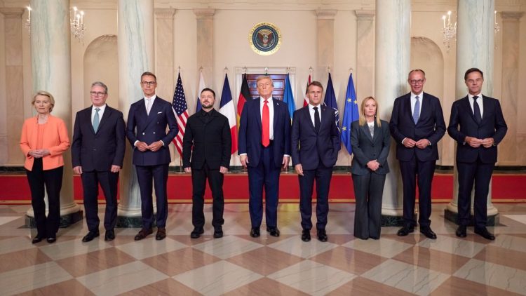 Trump, Zelenskyy, and EU leaders stand together at the White House during high-stakes peace talks on Ukraine (@WhiteHouse/X)