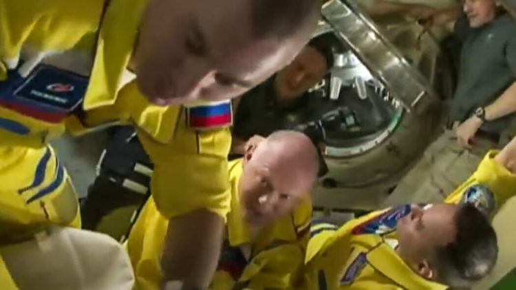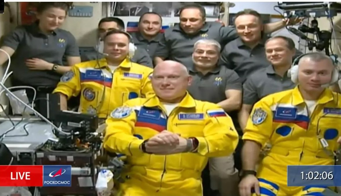 Three Russian Cosmonauts boarded the International Space Station wearing the colors of the Ukrainian flag. Image Credit: nytimes.com