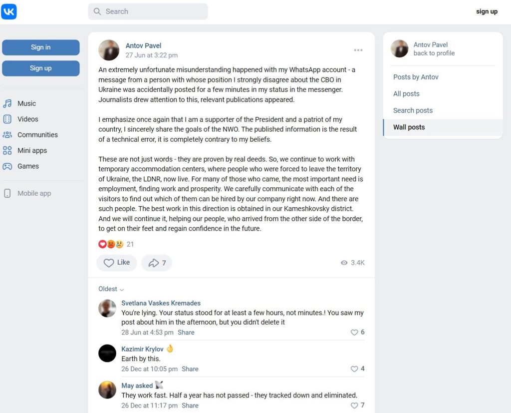 Antov took to social media and unconvincingly overexplained himself into a corner. He paid for his words with his life. Screenshot from vk.com