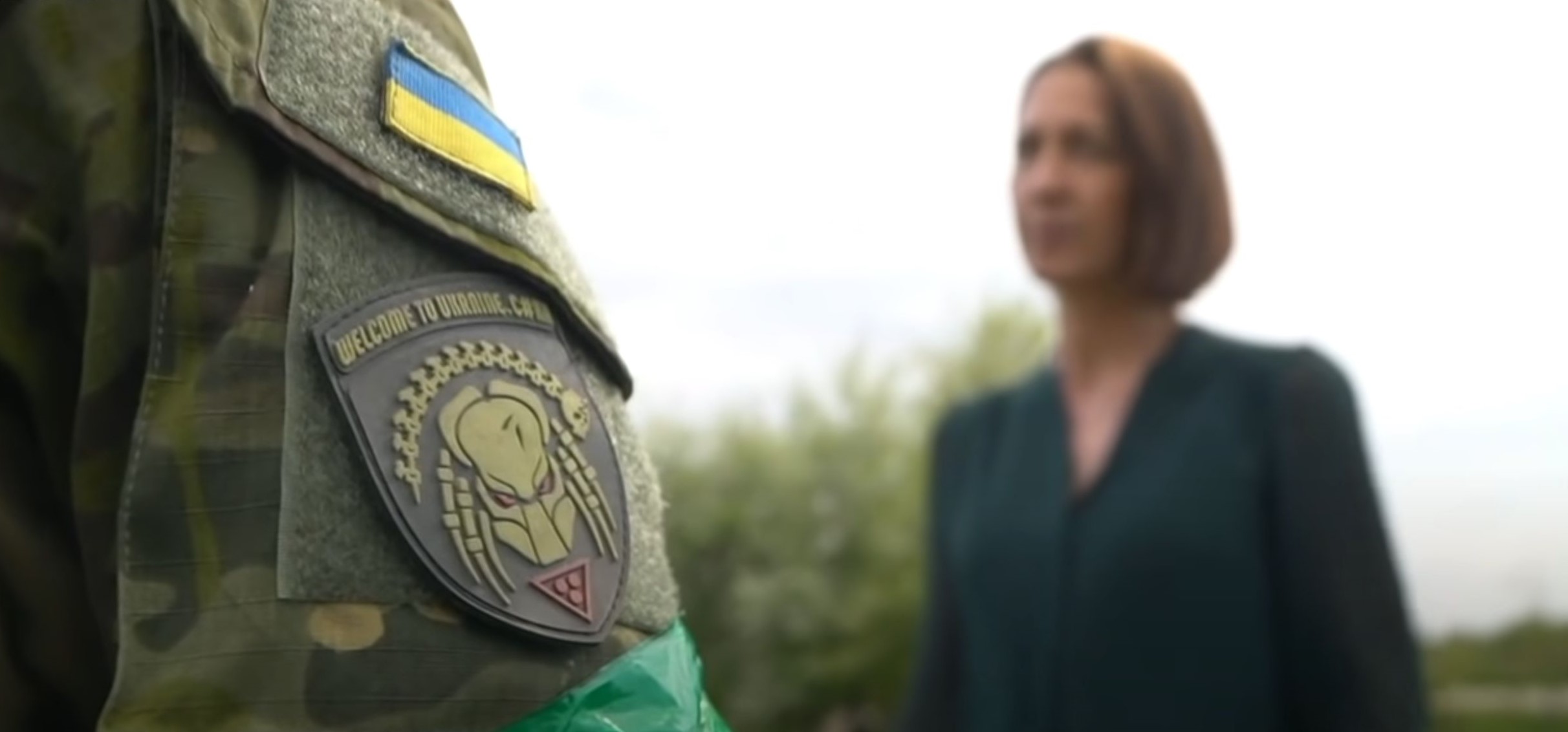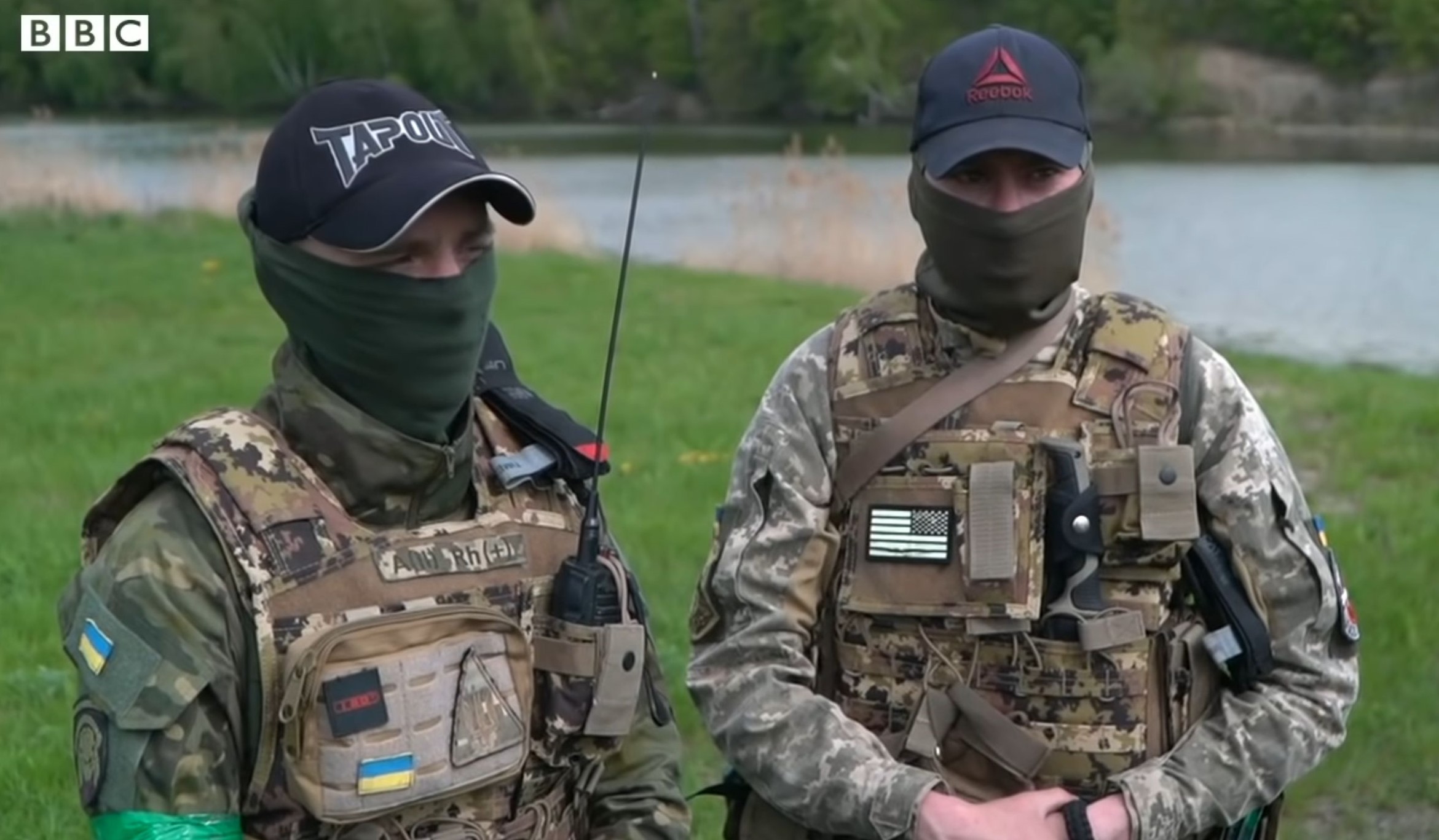 This is Sasha and Costia, both members of the Kraken Special Forces unit. Before the war, they were in the air conditioner sales business. Note the reversed US flag and the Kracken patch on the right arm of the soldier on the left. Screenshot from BBC YouTube video.A better shot of the Kraken unit identifier. Screenshot from BBC YouTube video.