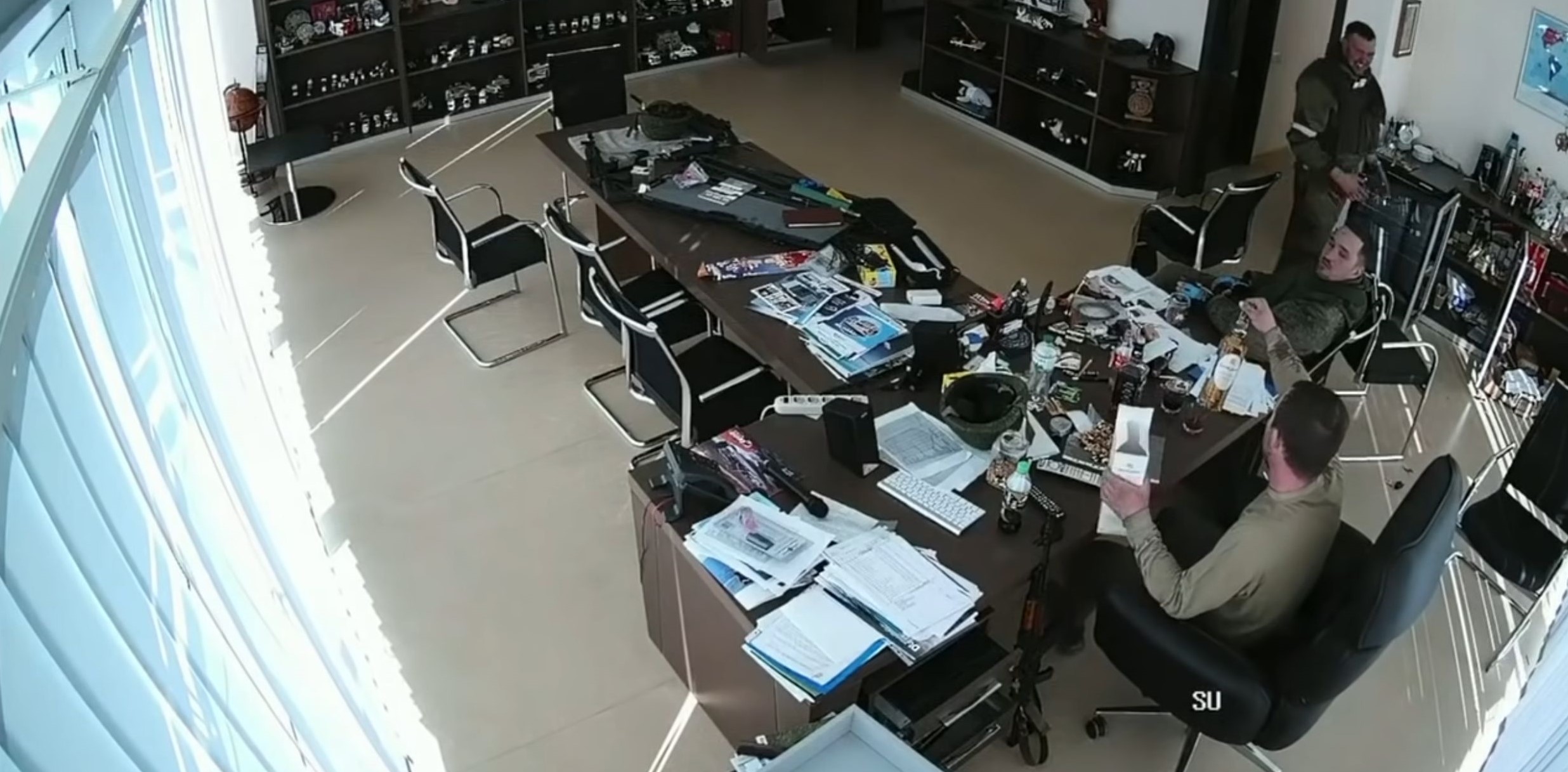 The Russians are shown here arriving on the scene in a stolen white van with the words “Russian Tank, Special Forces” spraypainted on the side. We also see the “V” symbol painted on the van, telling the world the troops inside are Russian Marines. Screenshot from BBC YouTube video.While Leonid bleeds out, the Russian Marines are looting the office of the business and have apparently discovered a nice bottle of scotch. At this point, they are unaware they are being recorded. Screenshot from BBC YouTube video.