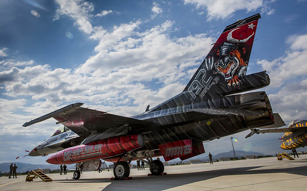 KONYA, TURKEY – MAY 12: A F-16 plane belonging to the Turkish Air Forces is seen during the NATO Tiger Meet 2015 drill press tour at the Konya 3rd Main Jet Base Command in Konya, Turkey on May 12, 2015. (Photo by Orhan Akkanat/Anadolu Agency/Getty Images)
