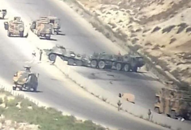 Turkish-led militias posted a photo of the Russian military convoy after it came under attack. The video shows one of the vehicles on top of a median along the Aleppo-Latakia Highway. Another video showed a damaged armored vehicle being towed away from the scene.