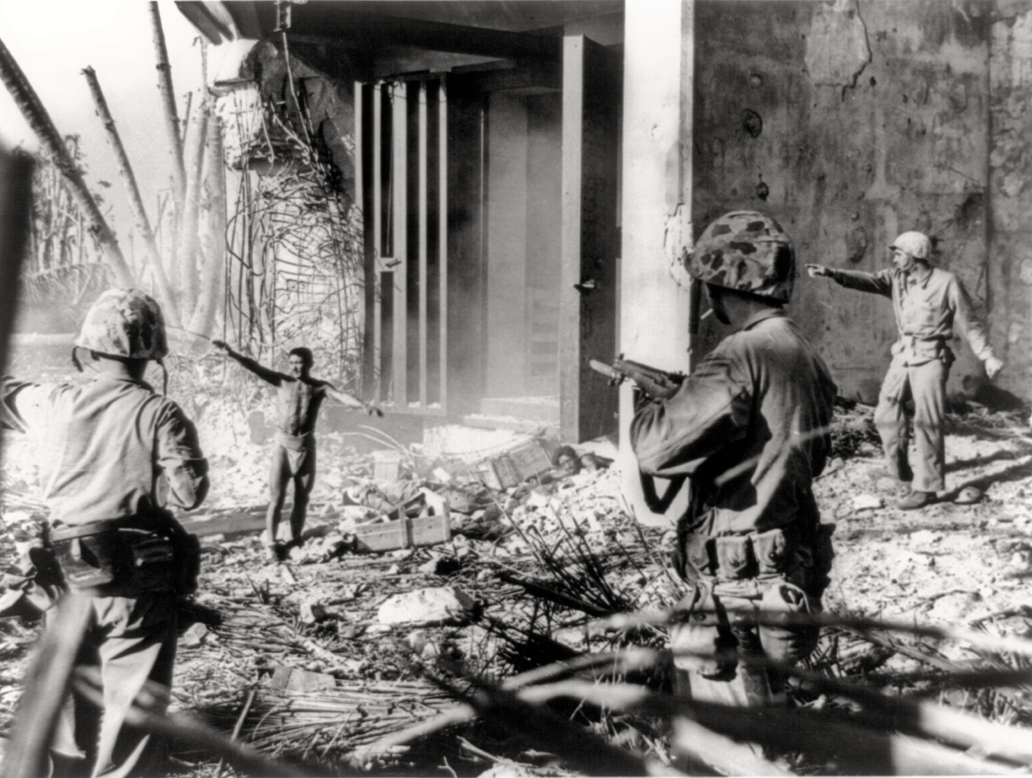 There are numerous pictures like the one below of Japanese soldiers surrendering in their underwear. This is not because they were surprised sleeping in their bunks, the Marines would demand they strip to ensure they were not concealing a knife, pistol or grenade. In the photo, you can see at least two of the Marines still have their weapons leveled at the Japanese soldier as they appear to be directing him to move to the rear in the midst of an active fight going on. Look to the left of the elbow of the Marine in the center of the picture, you can see another nearly naked Japanese soldier lying on the ground waiting to be told to get up by what is probably a language interpreter who appears unarmed in this photo or is an officer with just a sidearm.