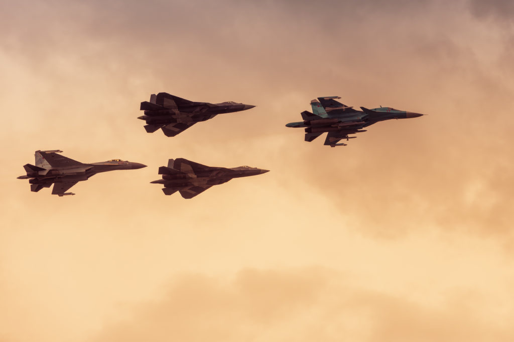 Modern Russian strike fighters, the Sukhoi Su-35, Su-34, and the two newest Su-57 (T-50 PAK FA), at the International Aviation and Space Salon (MAKS) in Zhukovsky. (Getty Images)