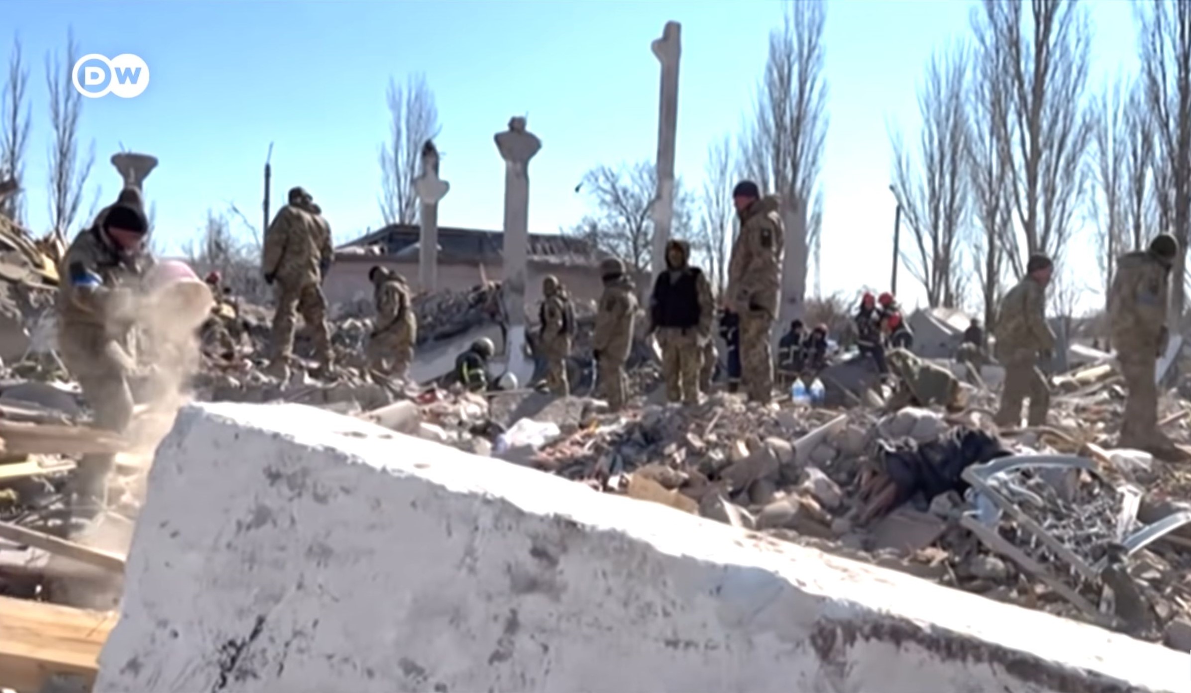 The aftermath of a Russian missile attack on the city of Mykolaiv earlier this year. Screenshot from YouTube and DW News.