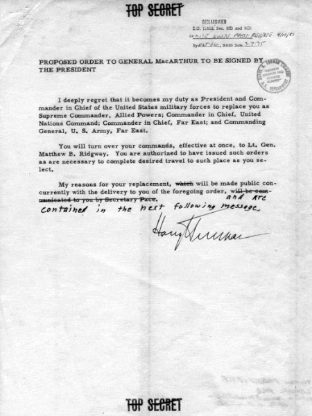 Proposed draft messages to Frank Pace, Douglas MacArthur, and Matthew Ridgway. (Harry S. Truman, Public domain, via Wikimedia Commons)