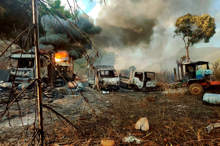 Burning vehicles with charred bodies in Myanmar contain 35 bodies of civilians after a massacre by government troops. Al-Jazeera photo