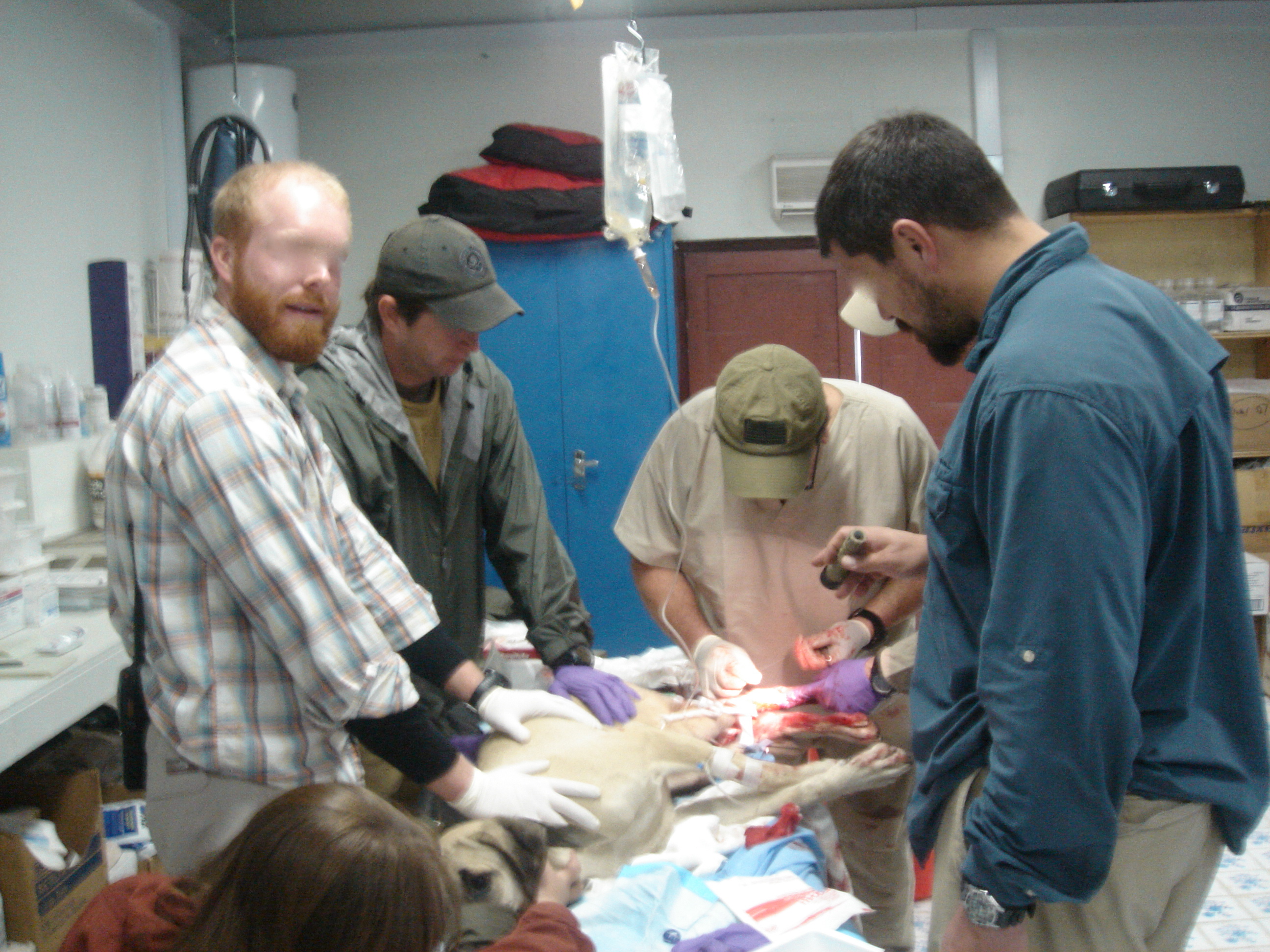 While the paramilitary case officer and I held Sandbag down on the table, Beth kept her muzzled, and whispered to her to keep her calm. Doc rooted around in that leg for the artery, found it, and proceeded to tie it off/sew it up. Truthfully, I don’t know exactly what the hell he did in there. I only know that he rooted around, found it, clamped it, and fixed it. Sandbag wailed like a banshee, thrashed quite a bit, and shook violently. She stayed conscious and alert, though, and stayed alive.