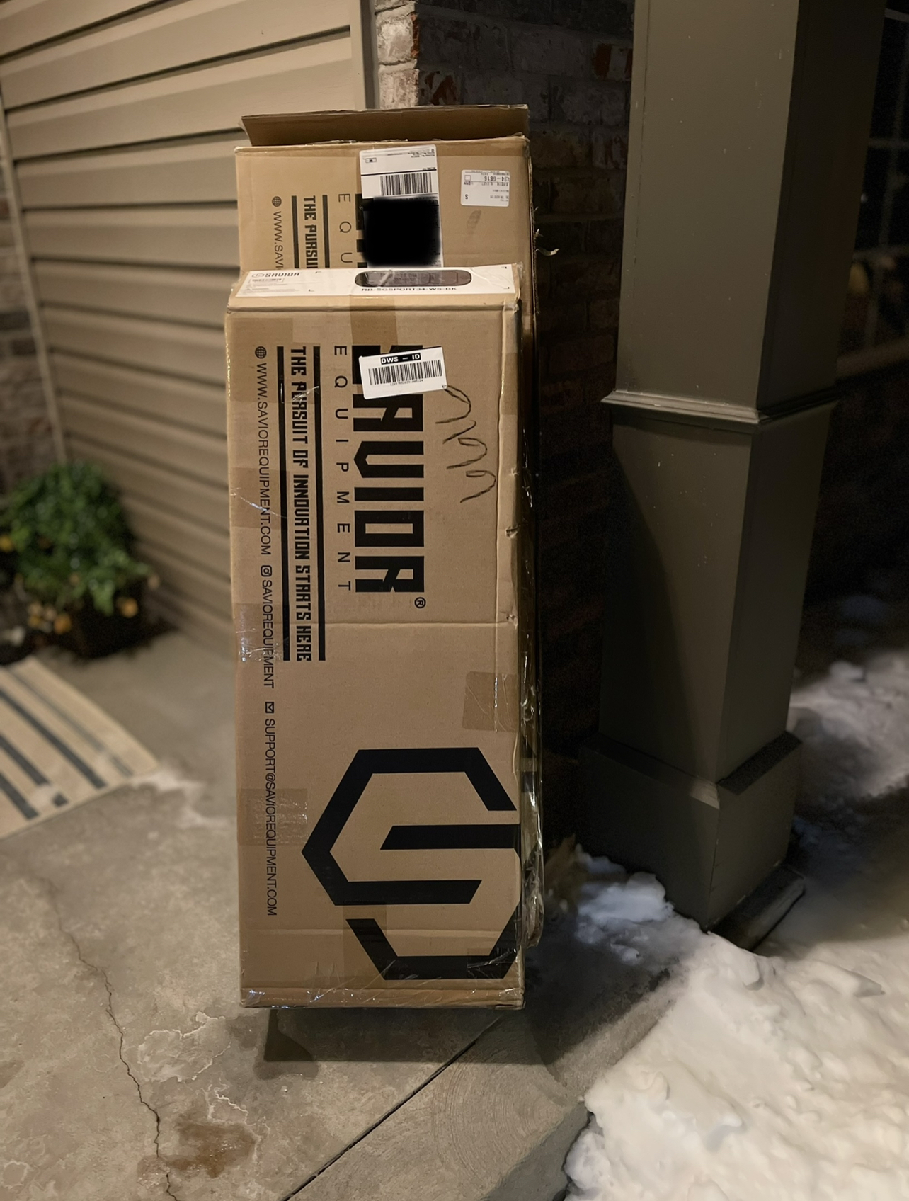 Stout boxes thoroughly taped together (top is open from the author looking inside prior to taking the photo). Also accompanying the boxes in the photo is the snow that briefly delayed their delivery! (Author photo)