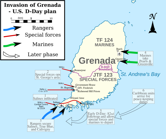 Map of combat units during the invasion: Green indicates the 22nd Marine Amphibious Unit, “Special Forces” denotes JSOC units Delta and ST6, and of course the Ranger elements in the South denoted in blue. *There were no Army SF units in Grenada*